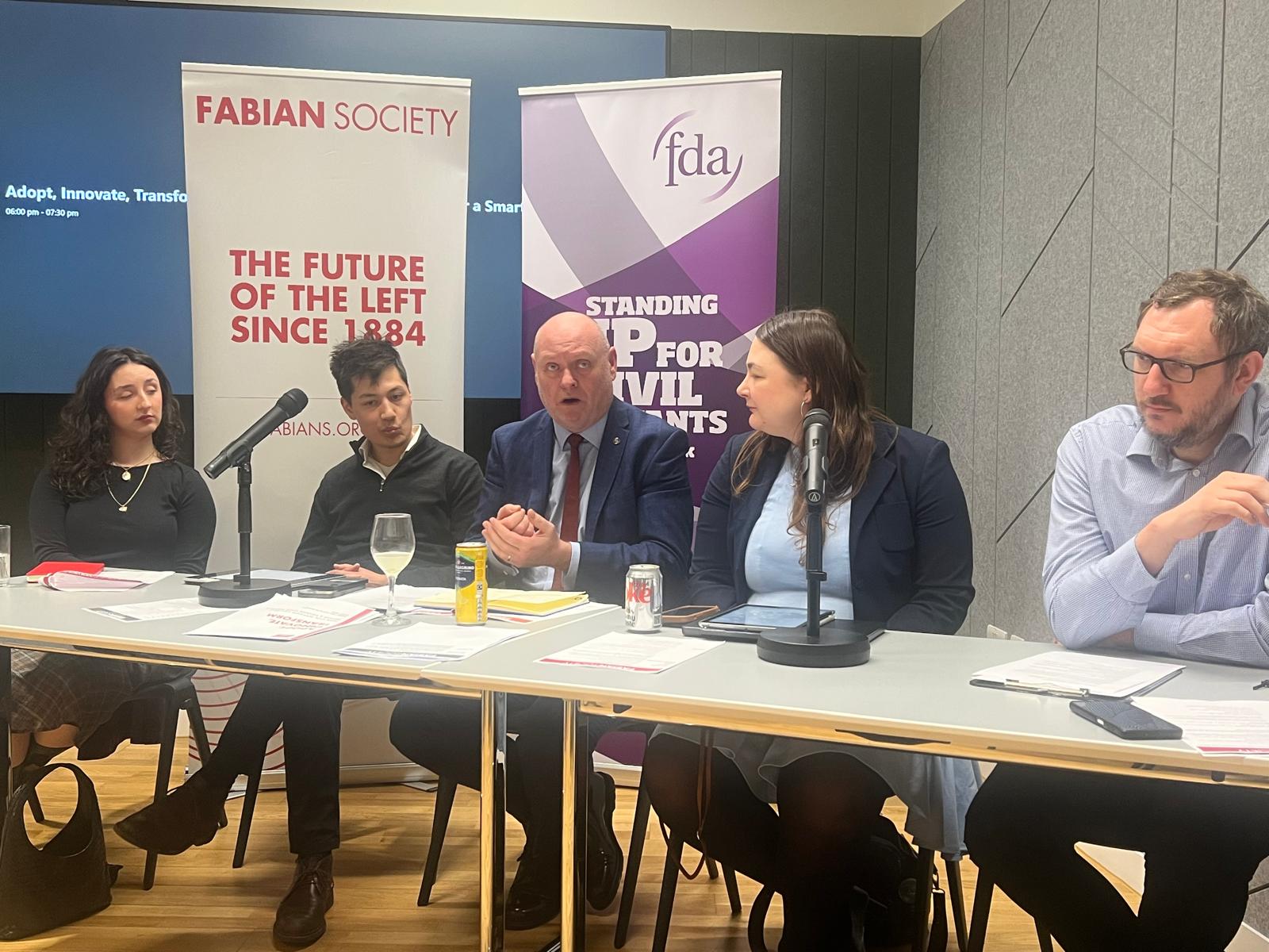 Report co-authors Sasjkia Otto and Aoife Donaghy, alongside former No.10 Downing Street Innovation Fellow Alexander De Ville, and FDA General Secretary Dave Penman launch new joint FDA/Fabian Society report at FDA HQ in London.